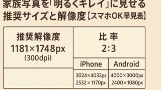 関連:推奨サイズと解像度(スマホOK早見表)|関連:写真が暗い?+0.3EVの明るさルール|関連:写真が“映える”余白とフォント